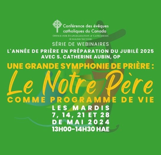 La Conférence des évêques catholiques du Canada (CECC) nous propose deux séries de webinaires intitulées « Une grande symphonie de prière » qui permettront aux fidèles de participer de façon significative à l’Année de la prière annoncée pour 2025 par le pape François le 21 janvier 2024.